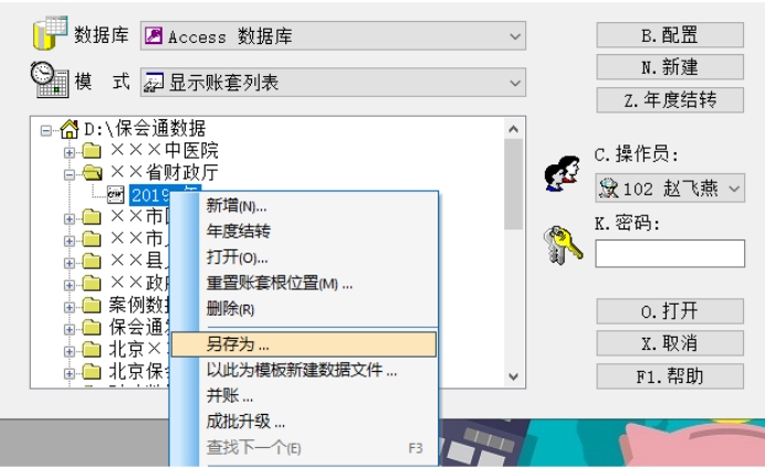 4、启动服务器或工作站上的保会通财务软件。在数据和用户登录(即打开保会通数据)框中,将数据库: